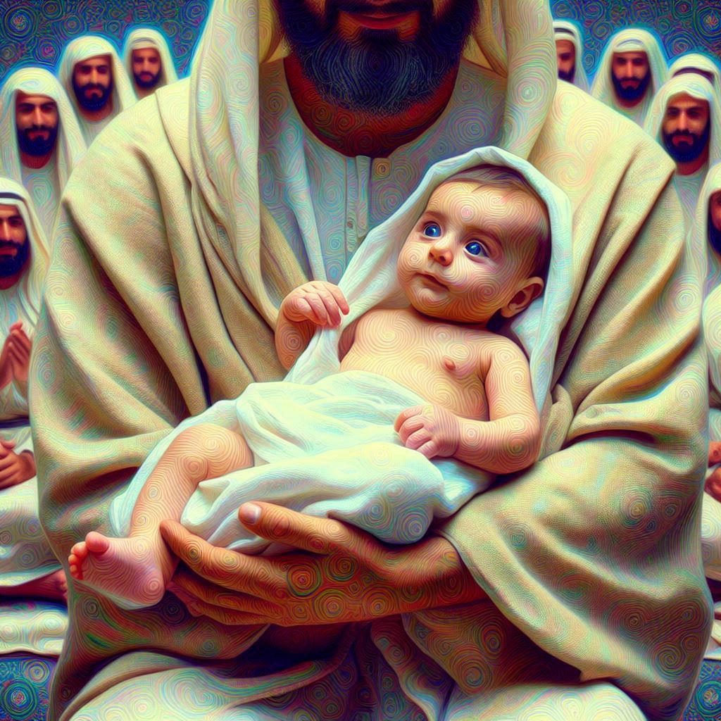 His face was clean and he was not too tall, not too short, and he was carrying a baby. There were several men following behind him who were also wearing robes and turbans.