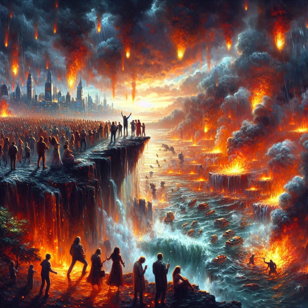I had a dream that the whole world was going to end. I was standing in a place that felt like the edge of the earth with lots of lava boiling below. The sky was showering so many fireballs – it was full of smoke. Everything looked yellow and reddish because of the fire everywhere.