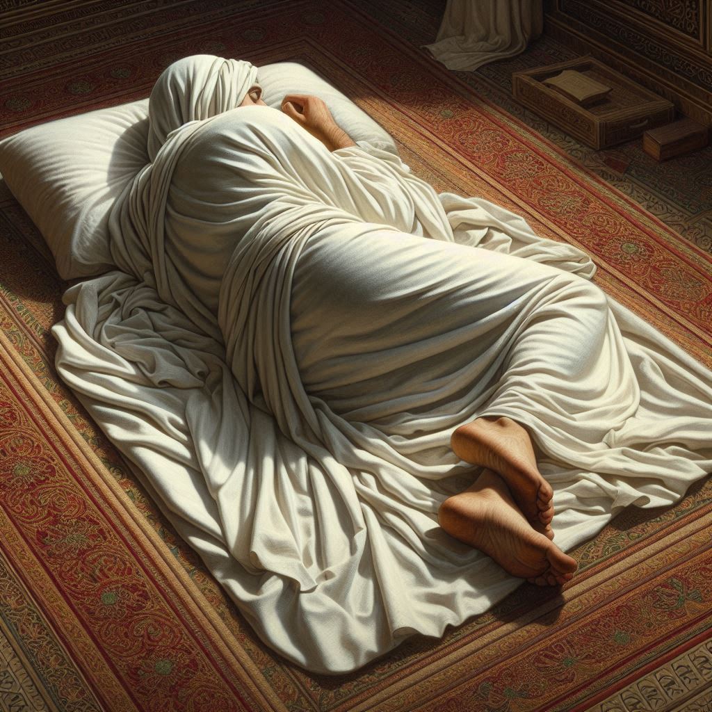 He was on his left side asleep on the ground. I walked up very close to his face and twice I said “this is the messenger of Allah”. He had black, curly, shoulder-length hair, no mustache, a small beard, and small lips. I even remember thinking my dream, “I did not expect his lips to look like that”.