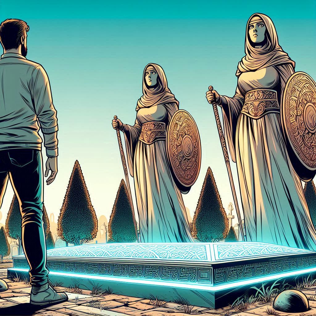 I was somewhere on earth as I could see the sky. It was a very beautiful, clear blue sky. I found myself standing in front of a grave on the side of a palace. On the grave was a rectangular carved stone and on the sides of the grave there were two statues of two warrior women, each carrying a shield in one hand and a short sword in the other. Behind these statues were a few medium sized trees perfectly cut and inline behind each statue and the grave was in the middle,