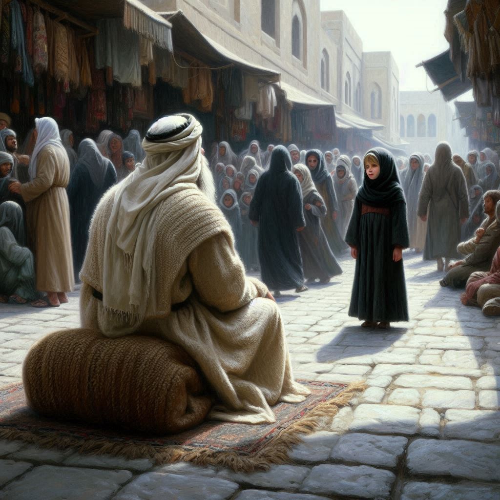He was sitting in the middle of a crowded place, kind of like a souq. He was sitting on the ground and his clothes were offwhite. He was directly looking towards me in a warm, welcoming way with a beautiful, beaming smile.