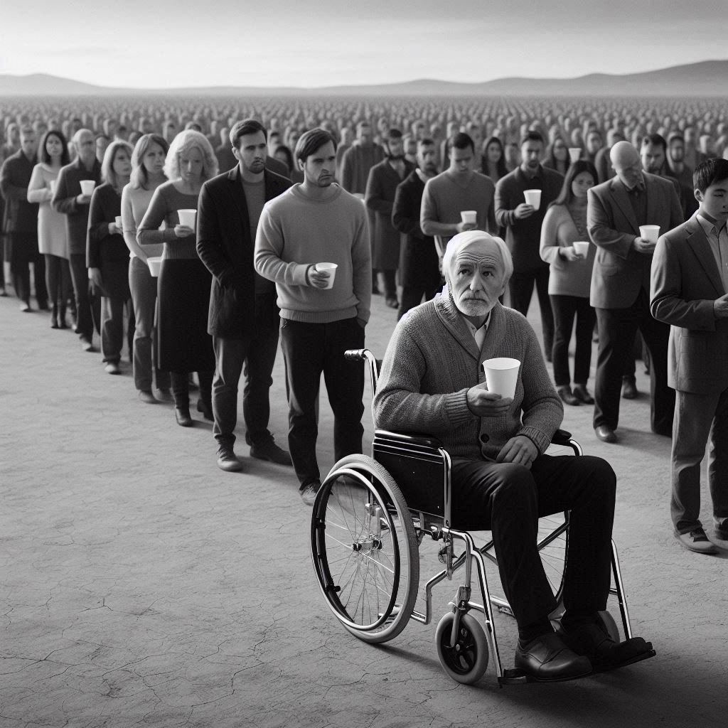 I was in a place with lots of people. I see myself sitting in a wheelchair and I see that someone is giving people water to drink as they are standing in a queue.